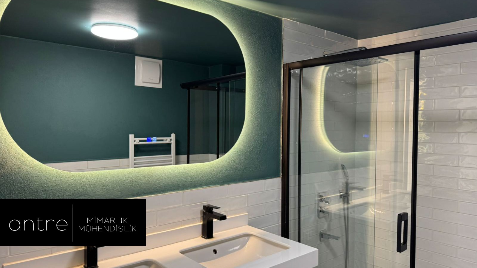 Banyo alanı, mevcut durumundan bağımsız olarak yeniden ele alınarak projeye dahil edildi.