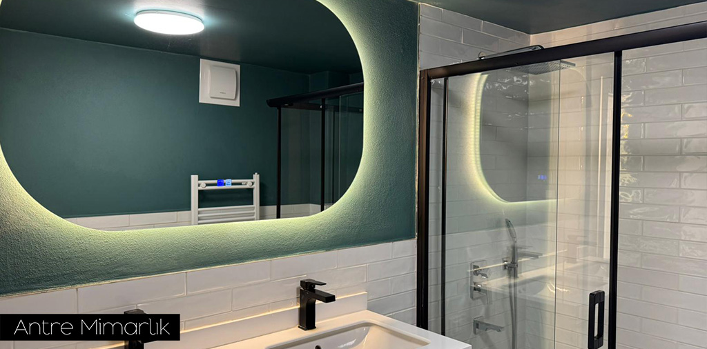 yüzeyler, banyoya yalnızca işlevsel değil, mekansal bir ifade kazandıracak biçimde seçildi.